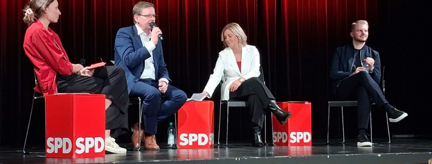 Tim Klüssendorf (r) kam aus Berlin, um das Erfolgsmodell Gilching selbst zu erleben- ein Erfolg, der dem scheidenden Bürgermeister Manfred Walter (2.v.l.) und seiner SPD zu verdanken ist. Auf dem Neujahrsempfang des Kreisverbands gemeinsam mit dem Ortsverein Gilching im dortigen Rathaus, perfekt orchestriert von den OV-Vorsitzenden Sophie Hüttemann und Christian Winklmeier, war der Generalsekretär Ehrengast und Festredner und konnte sich selbst ein Bild davon machen. So entwickelte sich die Gemeinde Gilching mit rund 20.000 Einwohnern zu einem liebens- und lebenswerten Ort. Eigene Gemeindewerke sorgen für Energie und Wärme, der maßvolle Ausbau von Gewerbegebieten im Laufe der Jahre bescherte dem Ort gute Steuereinnahmen und durch die Ansiedlung von High-Tech-Unternehmen wuchs auch der Ruf der Gemeinde als innovativer Standort. Die gute Verkehrsanbindung durch die S-Bahn und an die A96 trug zur Attraktivität der Gemeinde bei. So zogen immer mehr junge Familien nach Gilching, die ein gutes Angebot an Schulen, Kindergärten und Betreuungseinrichtungen vorfanden und etwas weiter weg von den Seen auch noch einigermaßen erschwingliche Grundstückspreise und Mieten. Der scheidende Bürgermeister hinterlässt nach 18 Jahren im Amt seiner potentiellen Nachfolgerin Steffi Weller (2.v.r.) ein wohl bestelltes Haus. Die 52jährige Bürgermeisterkandidatin mit langjähriger Verwaltungserfahrung will sich dafür einsetzen, dass alle Generationen im Ort eine gute Infrastruktur vorfinden. Auf der sog. Glatze sollen unterschiedliche Wohnkonzepte und neue Wohnformen für 1500 Menschen entstehen, so dass auch gerade ältere Menschen und Familien dort passende Wohnmöglichkeiten finden. Ein Mobilitätskonzept, das allen Verkehrsteilnehmern gerecht wird, soll dafür noch abgestimmt werden. In der Podiumsdiskussion, souverän moderiert von der Gemeinderätin und Jugendreferentin Selina Rieger (l.), wurde die Situation der Gemeinden noch einmal mehr deutlich.