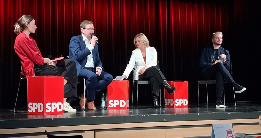 Tim Klüssendorf (r) kam aus Berlin, um das Erfolgsmodell Gilching selbst zu erleben- ein Erfolg, der dem scheidenden Bürgermeister Manfred Walter (2.v.l.) und seiner SPD zu verdanken ist. Auf dem Neujahrsempfang des Kreisverbands gemeinsam mit dem Ortsverein Gilching im dortigen Rathaus, perfekt orchestriert von den OV-Vorsitzenden Sophie Hüttemann und Christian Winklmeier, war der Generalsekretär Ehrengast und Festredner und konnte sich selbst ein Bild davon machen. So entwickelte sich die Gemeinde Gilching mit rund 20.000 Einwohnern zu einem liebens- und lebenswerten Ort. Eigene Gemeindewerke sorgen für Energie und Wärme, der maßvolle Ausbau von Gewerbegebieten im Laufe der Jahre bescherte dem Ort gute Steuereinnahmen und durch die Ansiedlung von High-Tech-Unternehmen wuchs auch der Ruf der Gemeinde als innovativer Standort. Die gute Verkehrsanbindung durch die S-Bahn und an die A96 trug zur Attraktivität der Gemeinde bei. So zogen immer mehr junge Familien nach Gilching, die ein gutes Angebot an Schulen, Kindergärten und Betreuungseinrichtungen vorfanden und etwas weiter weg von den Seen auch noch einigermaßen erschwingliche Grundstückspreise und Mieten. Der scheidende Bürgermeister hinterlässt nach 18 Jahren im Amt seiner potentiellen Nachfolgerin Steffi Weller (2.v.r.) ein wohl bestelltes Haus. Die 52jährige Bürgermeisterkandidatin mit langjähriger Verwaltungserfahrung will sich dafür einsetzen, dass alle Generationen im Ort eine gute Infrastruktur vorfinden. Auf der sog. Glatze sollen unterschiedliche Wohnkonzepte und neue Wohnformen für 1500 Menschen entstehen, so dass auch gerade ältere Menschen und Familien dort passende Wohnmöglichkeiten finden. Ein Mobilitätskonzept, das allen Verkehrsteilnehmern gerecht wird, soll dafür noch abgestimmt werden. In der Podiumsdiskussion, souverän moderiert von der Gemeinderätin und Jugendreferentin Selina Rieger (l.), wurde die Situation der Gemeinden noch einmal mehr deutlich.